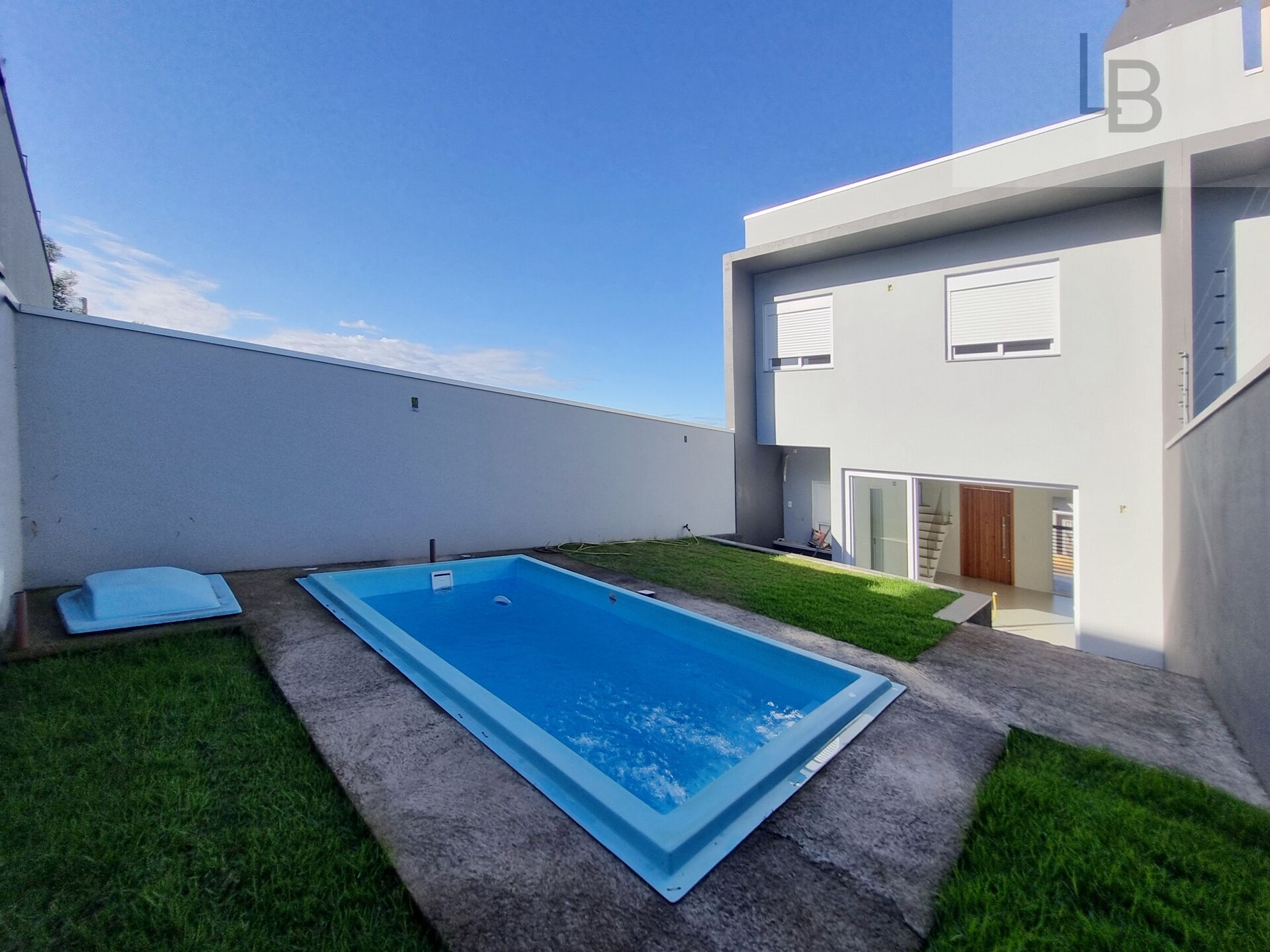 Casa com 141m² de área construída, sendo no pavimento térreo sala de estar, sala de jantar e cozinha, tudo integrado. Churrasqueira, lavabo, área de serviço e vaga para 2 carros.